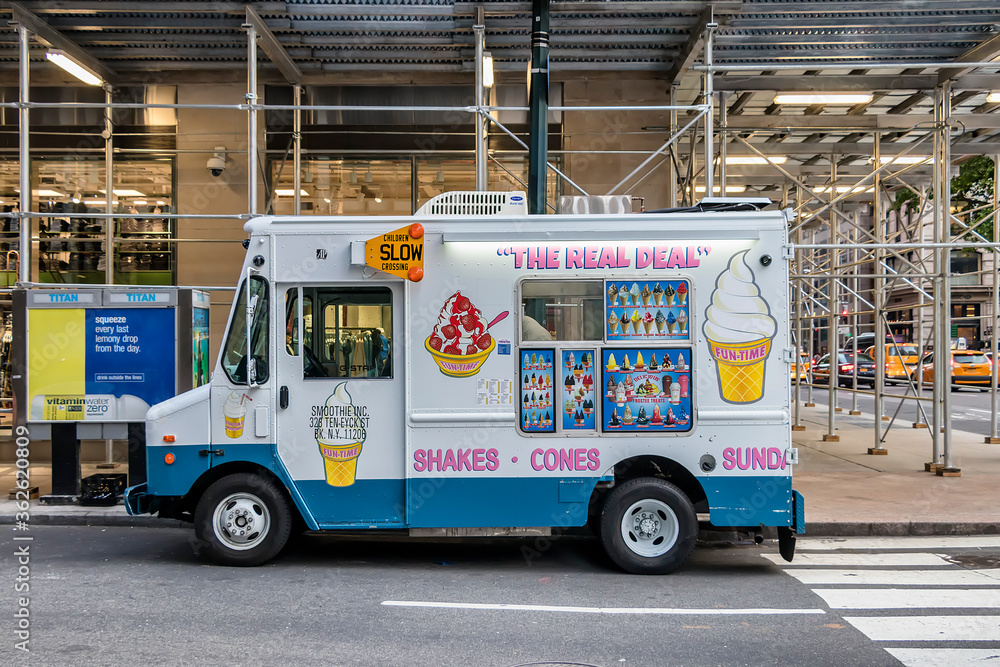 This is a New York City ice cream truck. Ice Cream brings back childhood memories and hearing the chime of the ice cream truck driving by. In the city that never sleeps these food trucks never slip.
